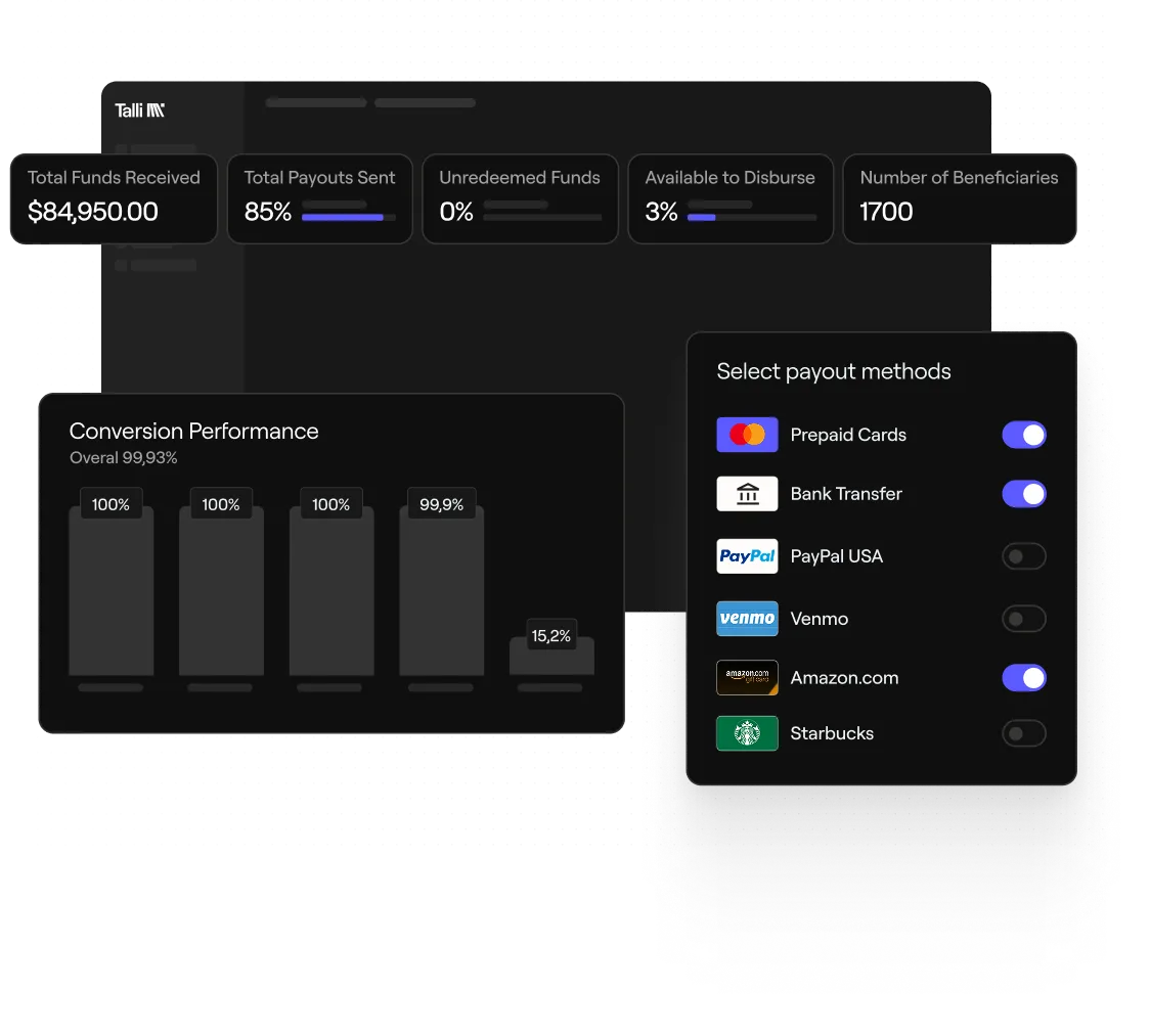 Whether it’s 1,000 or 100,000 recipients, Talli handles every payout with precision and speed.