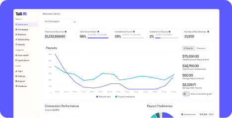 Talli offers a real-time dashboard for total control and visibility, allowing administrators to create payout distribution campaigns, track every payout status, and monitor completion rates without waiting for end-of-day batch reports or manual status updates.